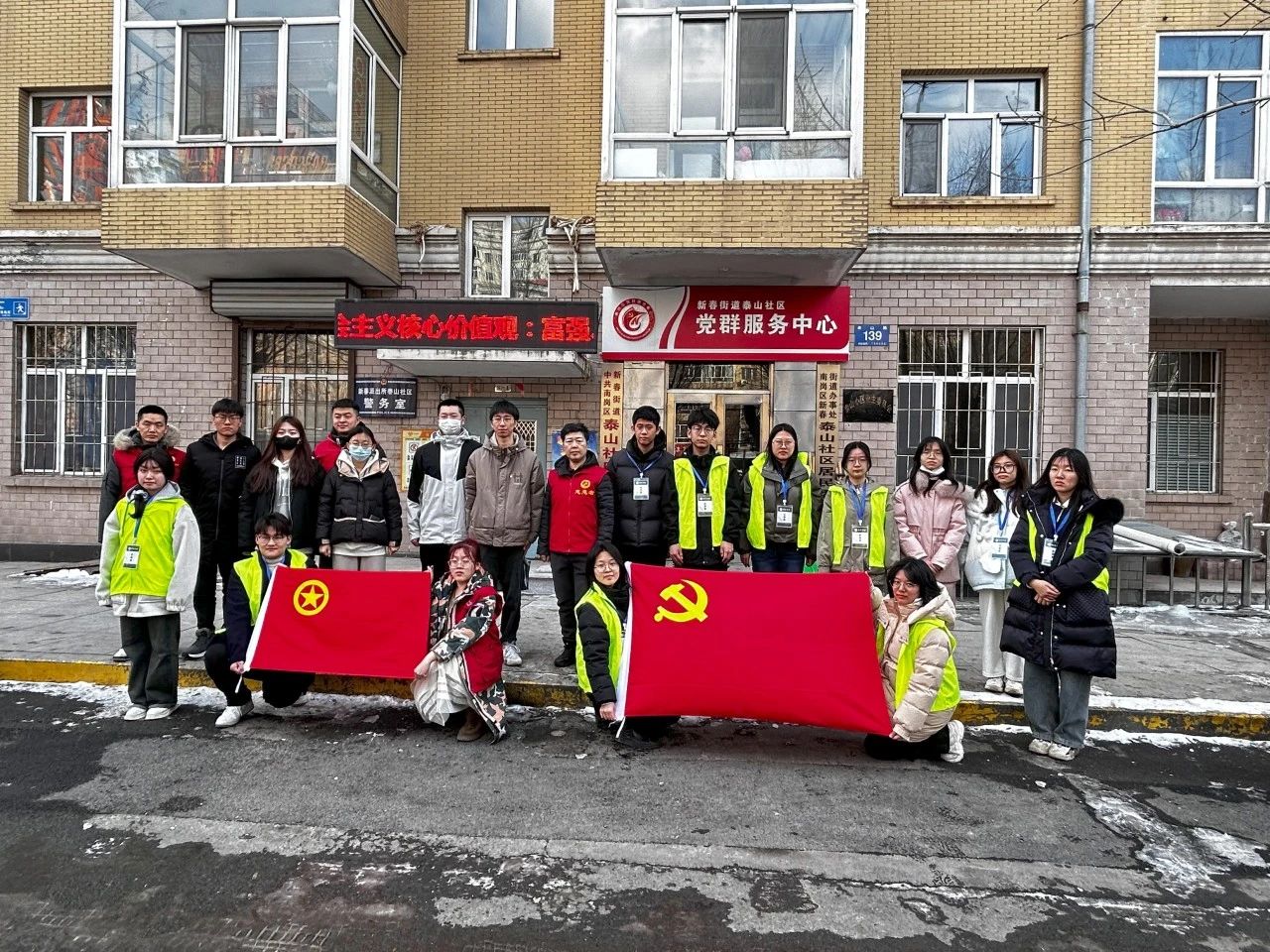宣讲结束后,同学们在社区内进行铲雪和擦拭健身器材的志愿服务,通过实际行动践行了习近平新时代中国特色社会主义思想和党的二十大精神,表现出青年人应有的时代担当。