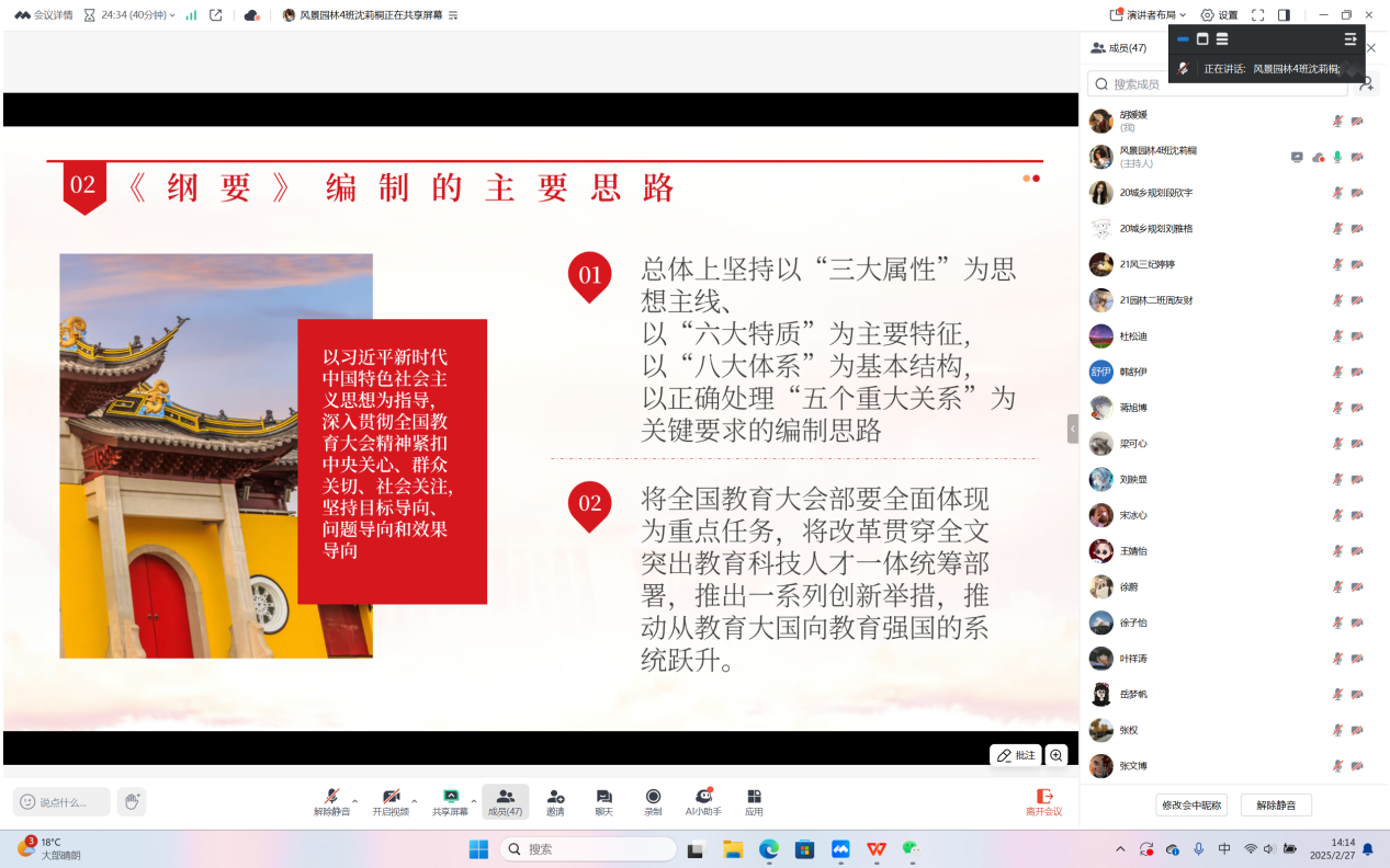 2025年2月27日,支部书记徐一鸣带领组织委员沈莉桐、宣传委员胡媛媛结合日常工作,从《纲要》出台的目的和意义、编制的主要思路、总体目标、结构和主要内容出发,到《纲要》的贯彻落实,以一堂别开生面的微党课,组织支部全体党员系统学习《纲要》。课上,向支部党员强调正确处理“五对关系”多形式、分层次组织开展学习活动,全面构建“八大体系”,部署“九个方面重点任务”,并明确建成教育强国的两个阶段和关键目标,确保每位支部成员都能深入理解和把握《纲要》的精神实质,引领全体党员在工作中发挥先锋模范作用,把思想和行动统一到党中央决策部署上来,推动学生工作高质量发展。
