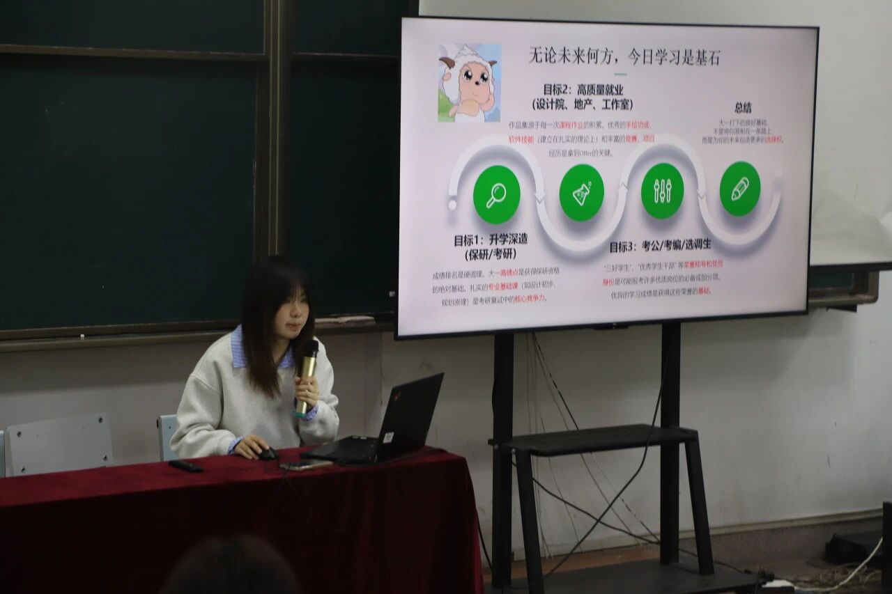 为了充分发挥高年级学生榜样引领作用,帮助新生做好更清晰的生涯规划,及时明确未来发展方向,26日晚上,学院安排了“学长学姐说”专栏,让优秀榜样对话新“园宝”们,参与本次分享会的包括国家奖学金获得者——2022级城乡规划专业杨诗语、2023级风景园林专业刘亚轩、2023级园林专业张滨慧,以及推免资格获得者——2022级风景园林专业刘雨晴、2022级园林专业胡启涵。5位学长学姐分别立足各自的专业,毫不吝啬地将自己的学习方法、科研竞赛、学生工作、专业技能等传授给同学们。