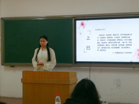 二号选手张靖楠则为我们带来了一个传统节日——上巳节,这个已经鲜为人知的传统节日在她的娓娓道来下如同画卷般在同学们面前徐徐展开,只是多了一份遗憾,在讲授的最后,她呼吁大家关注传统文化,追寻民族记忆,找回属于我们的那份“失落的上巳”。