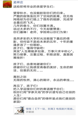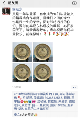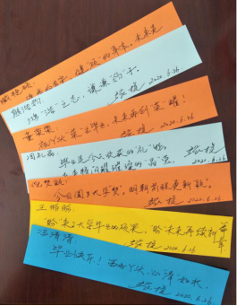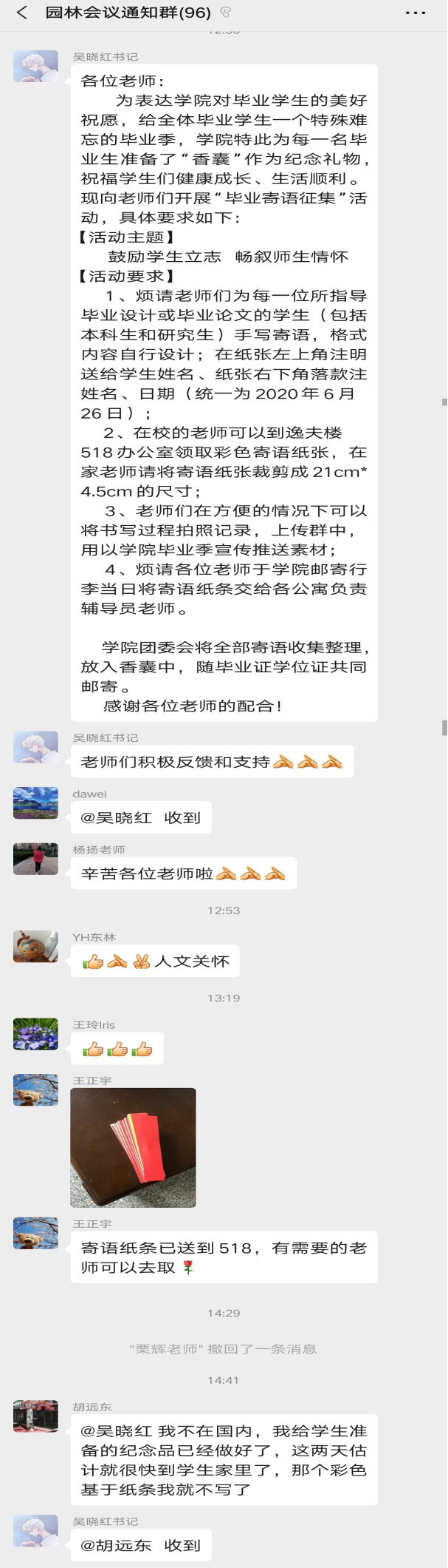 活动一经发布,便收获全院教师的积极响应,仅仅两天时间就集齐了所有寄语。我院胡远东老师因工作原因远在大洋彼岸,但依然心系毕业生,没办法手写寄语就定制了专属纪念品邮寄给所带的学生。张捷老师用心地将每一位同学的名字写进每一句寄语中,如“致熊浩钧同学:鸿‘浩’之志、谦谦‘钧’子。”风景园林专业负责人孟祥庄老师写到:“再见了,孩子们!把入学迎接你们时的寄语赠予你们:祝你们用‘学参天地’的学识谱写自己壮丽的人生!愿你们用‘德合自然’的情怀装点我们美丽的家园!”让众多毕业生泪目。每一位老师都将自己对2020届毕业生满心的关怀一笔一划地书写进成长锦囊中,六月雨中诵离别,惟愿相离莫相忘。