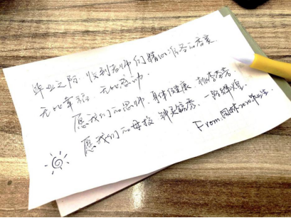 2020届本科生李诗璇在收到“成长锦囊”后,立刻写下回信向学校和老师们表达了感激之情:“毕业之际,收到老师们精心准备的香囊,无比幸福,无比感动。愿我们的恩师,身体健康,桃李芬芳;愿我们的母校,钟灵毓秀,一路辉煌。”