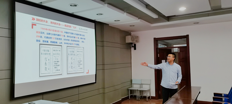 随后的微党课上,姚老师分析了党的第七次全国代表大会召开的背景,指出在德国法西斯面临彻底覆灭和中国抗日战争接近最后胜利的前夜,为了系统总结中国革命的基本经验,为了彻底打败日本侵略者、建设新中国做准备,在1945年4月23日至6月11日,党在延安召开了第七次全国代表大会;重点论述了七大的“党的政治路线”、“党的优良传统和作风”及“将毛泽东思想写在了党的旗帜上”;详细解读了七大的历史意义,以毛泽东主席在七大闭幕会上的致辞“我们开了一个很好的大会”、“我们开了一个胜利的大会,一个团结的大会”结束了微党课的分享。