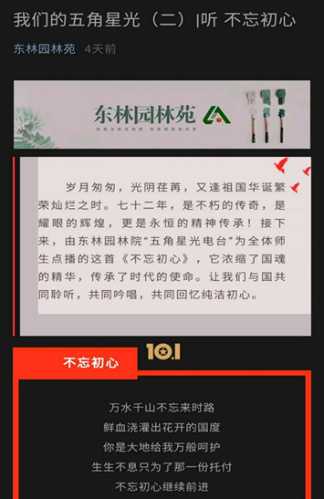感慨于疫情的严峻,却又不能浇灭园林学子心中爱国之火,互联网牵起了学子之心,也让同学们经历了一次特殊的线上云端群众性主题活动,通过屏幕会议往昔历史,积极互动,传达欢愉之情。这次以“我和我的祖国”为主题的活动,主要通过推送、线上歌唱比赛等形式来进行,师生们通过学唱、传唱,仿佛身临其境,拉近了彼此的距离。师生情与友情也在那一刻融合交汇成亲情,园林家人们,不仅沉浸于音乐,也抒发了自己浓浓的爱国情怀!