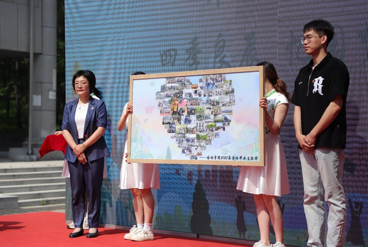 学院院长王竞红代表学院与毕业生代表互换纪念礼物。学院送给全体毕业生的是一枚精心定制的印章,代表一种约定、一种信任。印章中封存的花草见证着同学们的每一步成长,定制的印章刻着每一名毕业生的名字,希望毕业生们不忘为生态文明建设和美丽中国建设努力奋斗的初心和使命,更要诚信为人,心心相印,勇敢前行。毕业生们送给学院老师的礼物是大学中点点滴滴的照片拼图,另一面是毕业生们一笔一划写下的对学院、老师和同学们的祝福。