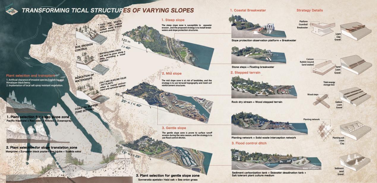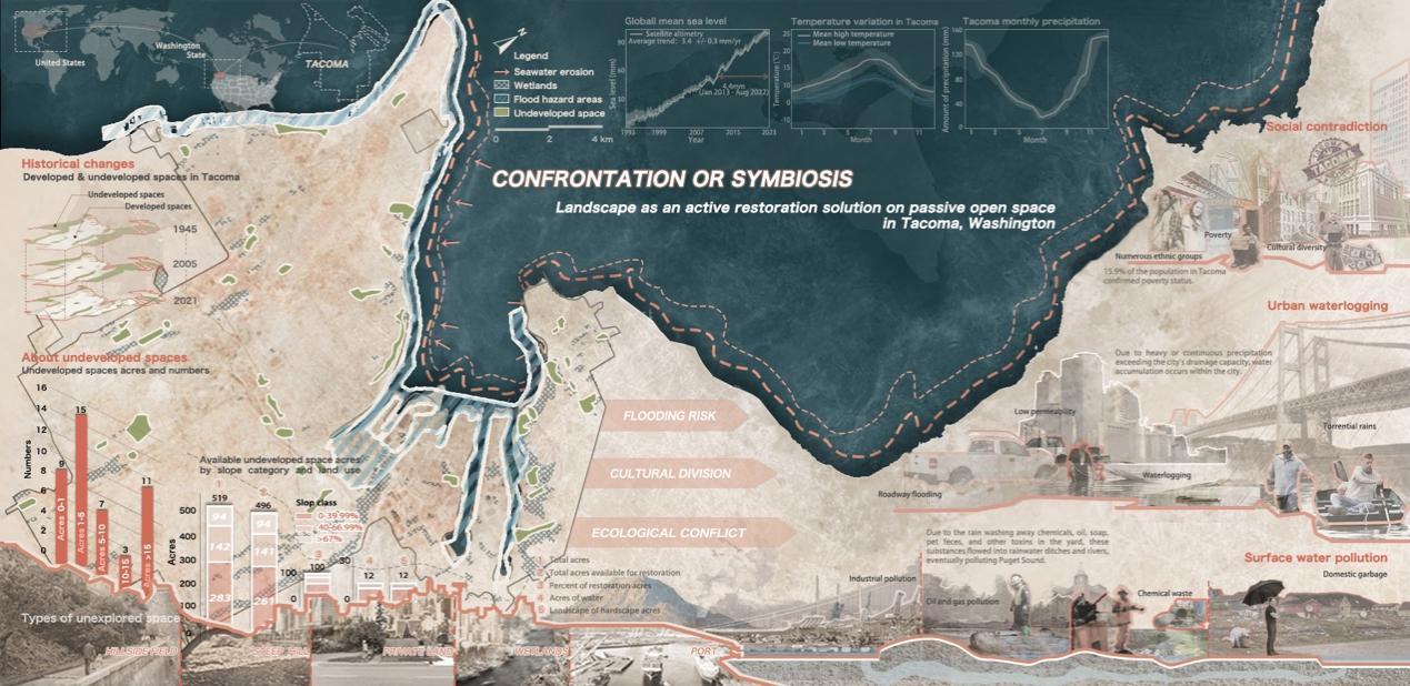 我院获奖作品为《对抗与共生——景观作为城市被动开放空间的主动营建方案》。该方案以美国塔科马市为例,针对塔科马市面临着气候危机下的雨洪风险、城市文化分化的社会矛盾和大量未开发用地的生态冲突等特点,设计并实施了一个城市主动营建的管理框架,建立了城市水系统和被动开放空间之间的共生系统。它将培育出一种集社会生活、经济生产力和特色文化于一体的可持续城市发展模式,并以塔科马为例,推广被动开放空间弹性规划的应用,实现全球多群体生境的自恢复。