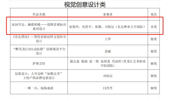 10月29日,大兴安岭地区“北极光”杯文旅创意设计大赛获奖名单最终揭晓!由我校Betway体育西汉姆联张俊玲教师带队,伍舒亭硕士研究生、张敏教师、司海辰硕士研究生组成的团队原创作品《冰封兴安,渔歌唱晚—道路景观标识系列设计》从471件作品中脱颖而出,荣获视觉创意设计类金奖,是本次大赛视觉创意设计类最高奖项。