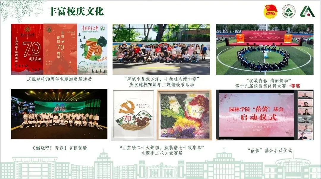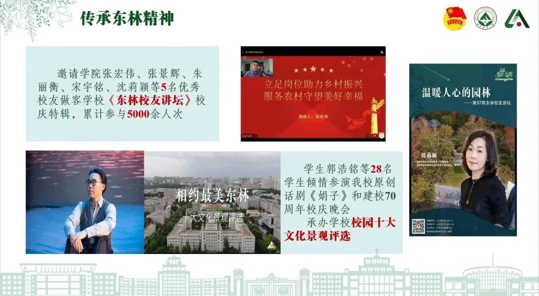 邀请学院张宏伟、张景辉、朱丽衡、宋宇铭、沈莉颖等5名优秀校友做客学校《东林校友讲坛》校庆特辑;郭浩铭等28名学生倾情参演学校原创话剧《娟子》与建校70周年校庆晚会;承办学校校园十大文化景观评选;“青春相遇70年”校庆主题团日活动覆盖学院全部团支部,用园林人的赤诚传承东林精神。