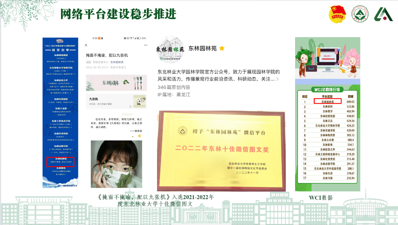 园林团委先后组织了“喜迎二十大”滴胶主题亲子活动和“指尖芳华”微景观创作比赛等系列活动,积极参与东林版《领航》拍摄,获得学校校园大合唱一等奖和青春读诗会二等奖等奖项;持续提升“青年大学习”网上主题团课完成率,2022年度整体参与率95.25%;截止2023年3月末,微信公众号平台阅读量、点赞率再创新高,微信平台粉丝数达6121人,年度推出图文1504篇,其中原创内容346篇,单日浏览量最高达24126次,总浏览量达615145次。