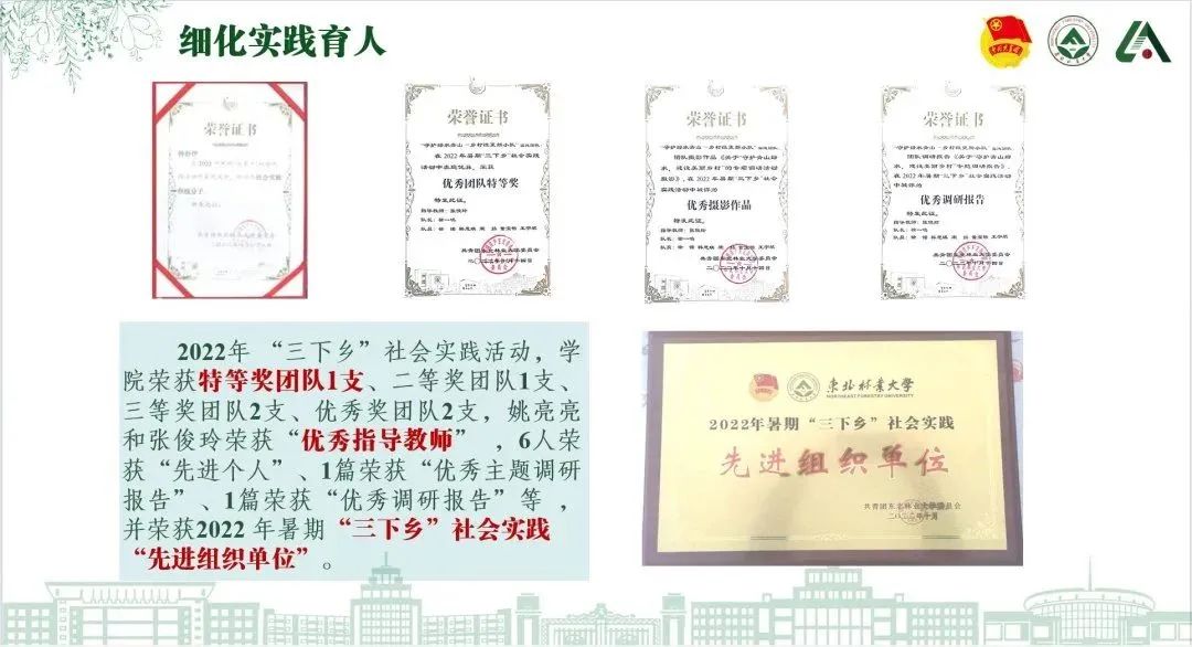 在2022年大学生志愿者暑期文化、科技、卫生“三下乡”社会实践活动中,学院荣获特等奖团队1支、二等奖团队1支、三等奖团队2支、优秀奖团队2支,姚亮亮和张俊玲荣获“优秀指导教师”,6人荣获“先进个人”、1篇荣获“优秀主题调研报告”、1篇荣获“优秀调研报告”、2篇荣获“优秀调研心得”、2份荣获“优秀视频作品”、2份荣获优秀摄影作品,学院荣获2022 年暑期“三下乡”社会实践“先进组织单位”。
