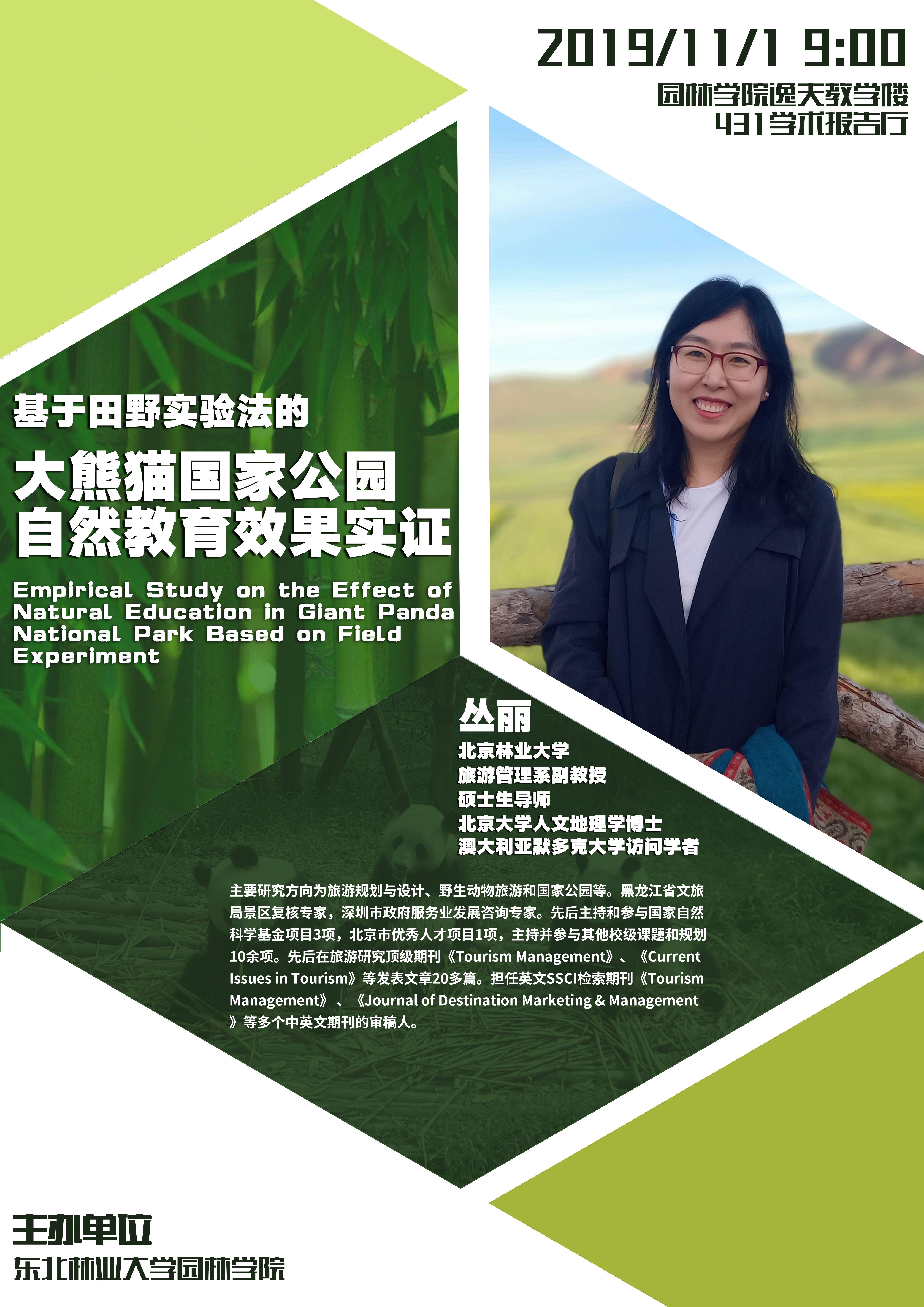 报告人简介:丛丽,辽宁大连人,女,北京林业大学Betway体育西汉姆联旅游管理系副教授、硕士生导师。北京大学人文地理学博士,澳大利亚默多克大学访问学者。 主要研究方向为旅游规划与设计、野生动物旅游和国家公园等。黑龙江省文旅局景区复核专家,深圳市政府服务业发展咨询专家。先后主持和参与国家自然科学基金项目3项,北京市优秀人才项目1项,主持并参与其他校级课题和规划10余项。先后在旅游研究顶级期刊《Tourism Management》、《Current Issues in Tourism》、《旅游学刊》等发表文章20多篇。担任英文SSCI检索期刊《Tourism Management》 、《Journal of Destination Marketing & Management》等多个中英文期刊的审稿人。
