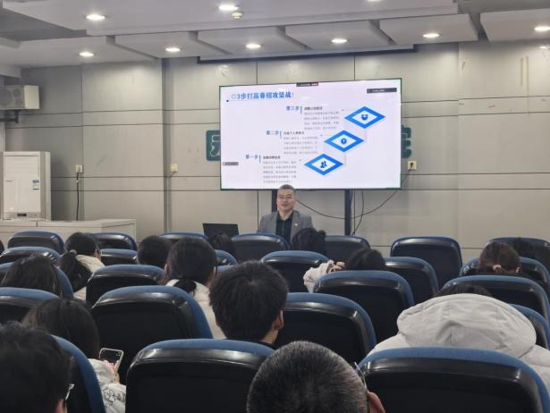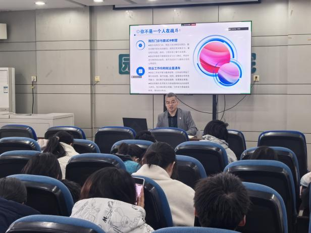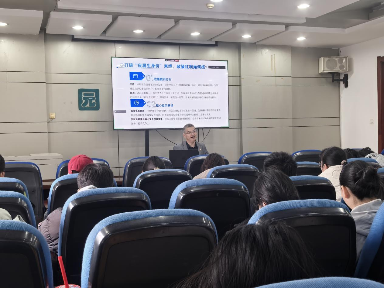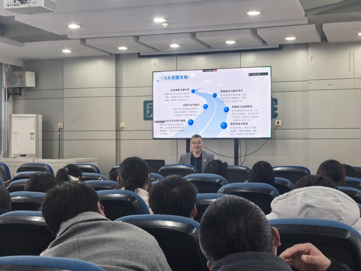 赵书记指出,全国多地已放宽应届生身份限制,为同学们破除误区,鼓励大家“先就业再择业”,呼吁大家摒弃“死守身份”观念,优先积累职场经验。传统行业面临严峻压力,设计院效益持续下行,房地产市场需求明显收缩,致使岗位竞争愈发激烈,赵书记提出六大突围方向“生态修复与碳中和”、“智慧城市与数字孪生”、“文旅与乡村振兴”、“新媒体与品牌策划”、“公共艺术与用户体验”、“教育咨询与培训”,鼓励同学们紧跟国家政策,将个人职业发展与国家需求紧密结合。他强调,面对行业变革,应保持开放心态,勇于尝试新兴领域,不断提升自身专业技能与创新能力,以适应未来职场的多变需求。同时,赵书记还分享了学院近年来在毕业生在新兴领域就业的成功案例,为同学们提供了宝贵的实践参考。