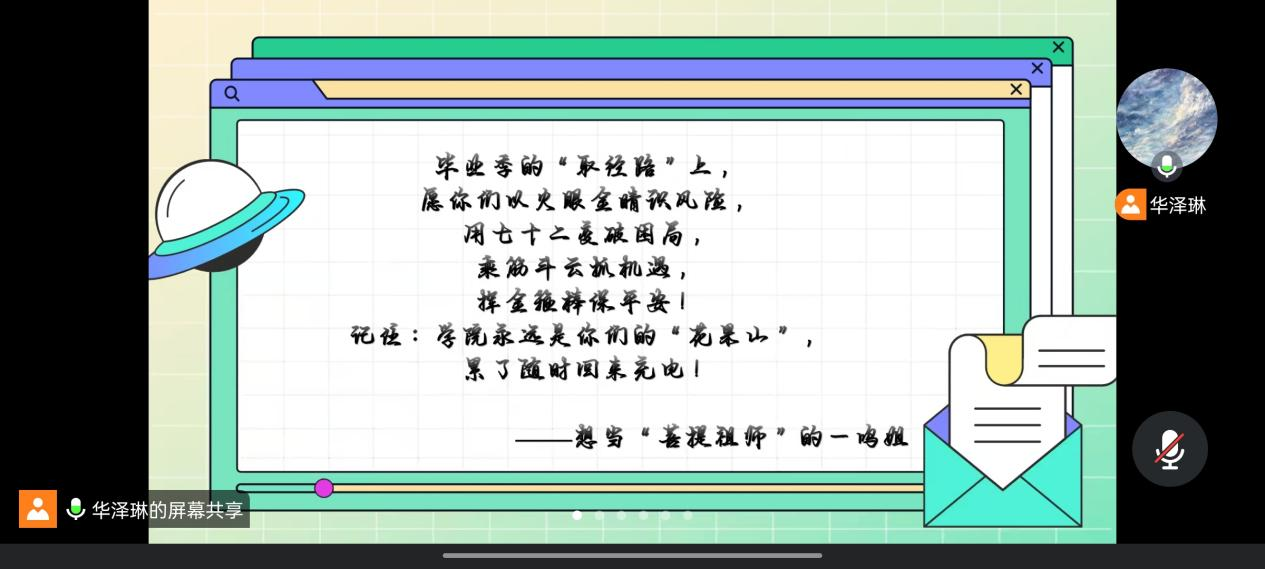 会议最后,徐老师指出,毕业的“取经路”上,只有像悟空一样,按部就班地推进任务,严谨地进行时间管理,并且具备长远的目光,不被眼前的事物所局限,才能规划好自己的人生道路,取得“真经”。愿每位同学以悟空的智慧与勇气,披荆斩棘,以火眼金睛识风险,用七十二变破困局,乘筋斗云抓机遇,挥金箍棒保平安!学院将永远是大家的“花果山”,累了随时回来充充电!